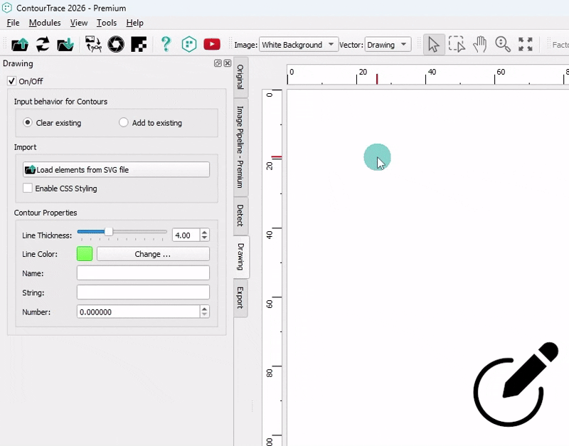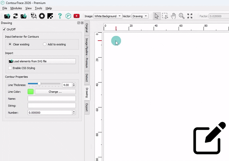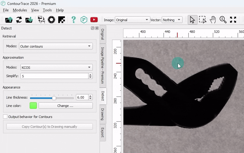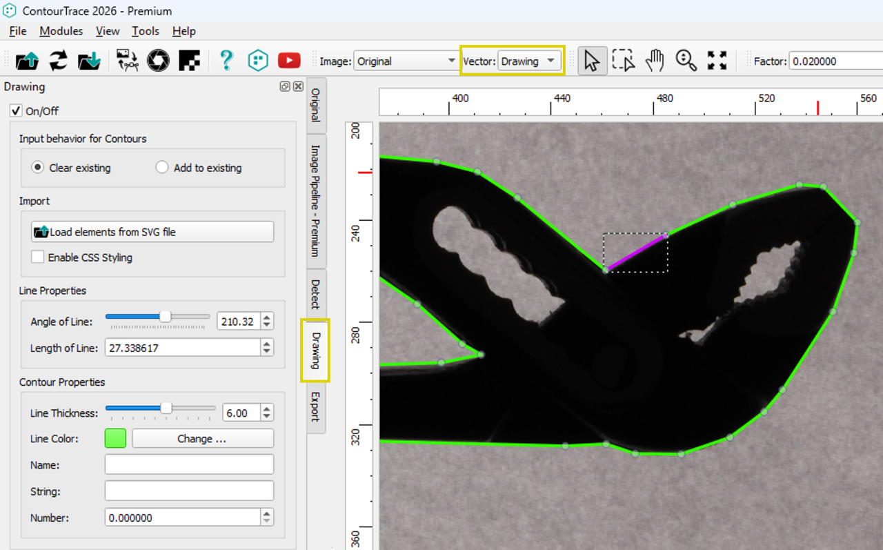 L'opérateur de dessin permet d'éditer et d'affiner avec précision les contours vectoriels directement dans ContourTrace, en fournissant des outils puissants pour la manipulation avancée des contours et en garantissant des résultats nets, précis et prêts à l'exportation, sans qu'il soit nécessaire d'utiliser un logiciel de CAO externe.