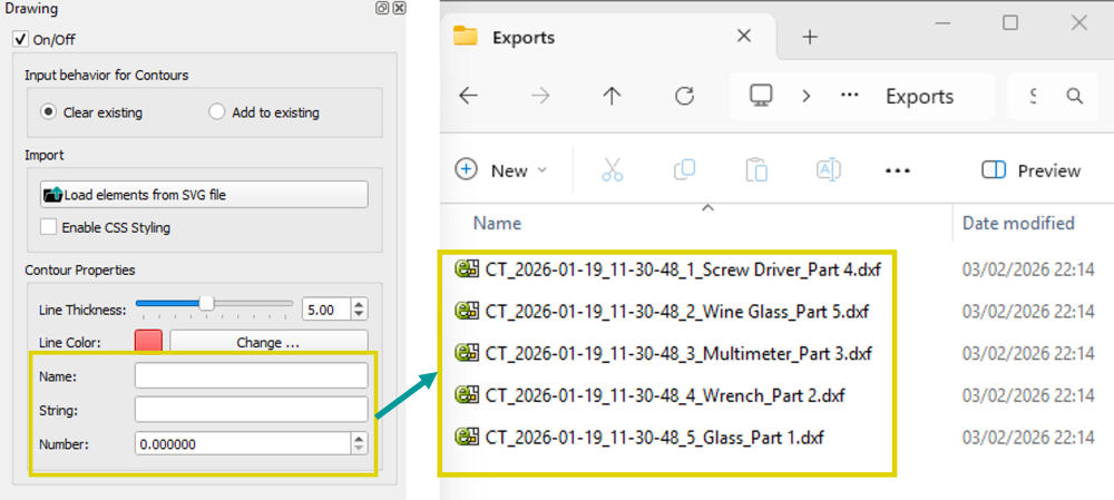 Assign names, depth, and custom metadata to each contour and export them with DXF files. Contours can be saved as separate files with their associated metadata, enabling smoother CAD workflows and reliable integration with downstream tools, including FreeCAD macros.