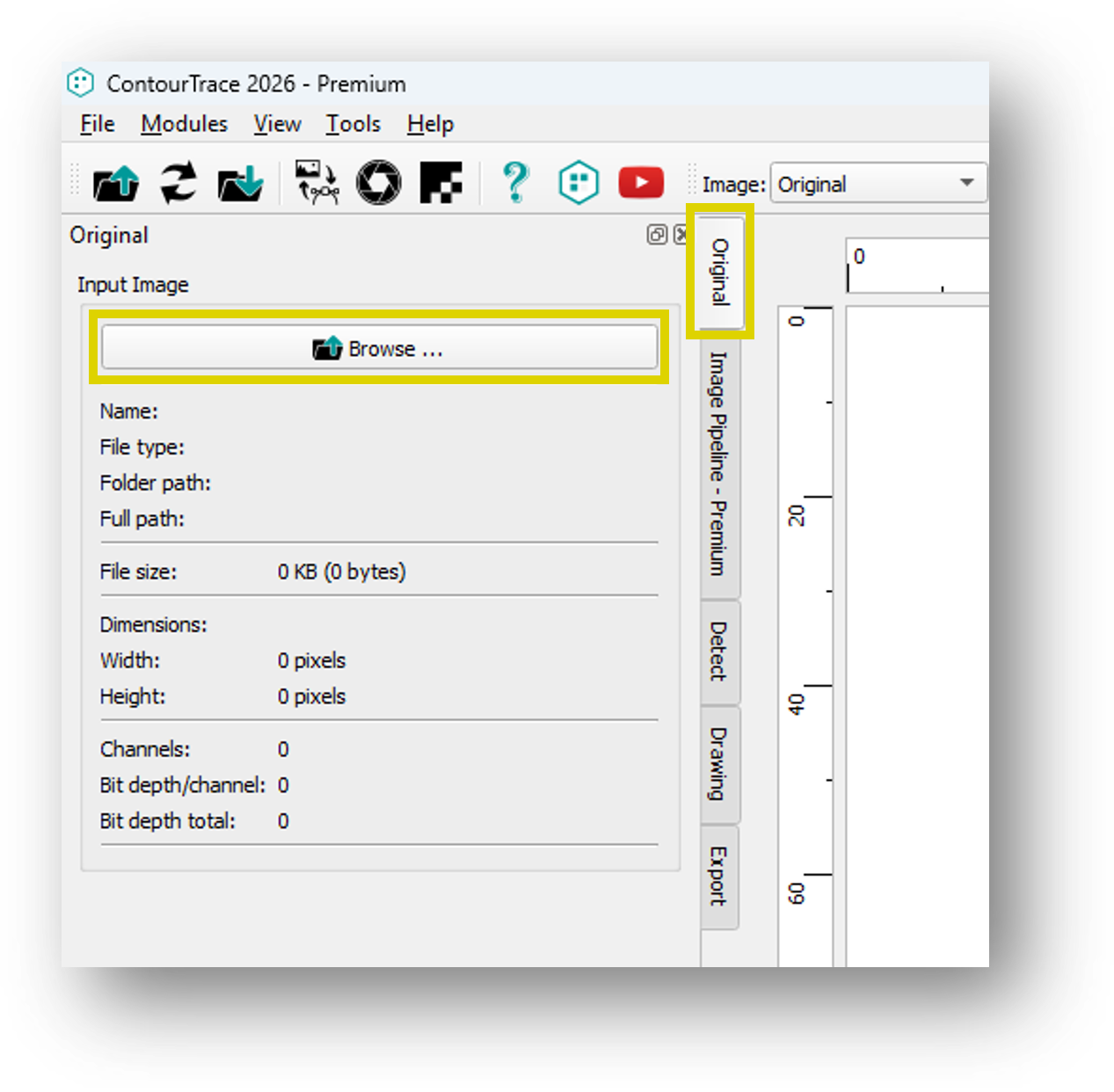 The Single Image Input Operator enables the import of standard image files into ContourTrace as raster graphics for further processing and contour extraction. Supported file formats: .jpg, .jpeg, .bmp, .png.