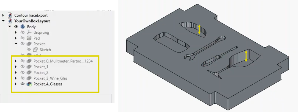 Exports contour metadata directly into FreeCAD, displaying contour names and strings in the Feature Tree. Defined depth values are applied automatically, enabling accurate and consistent 3D operations based on the assigned metadata.